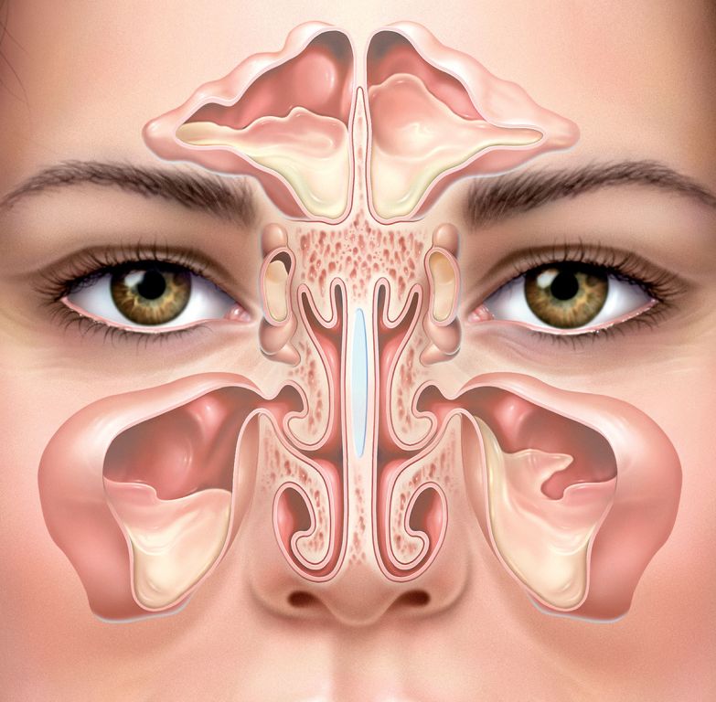• Анатомические особенности, такие как узкие носовые проходы, искривление носовой перегородки, сужение устья пазухи и костные дефекты черепа.
